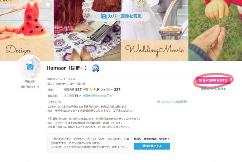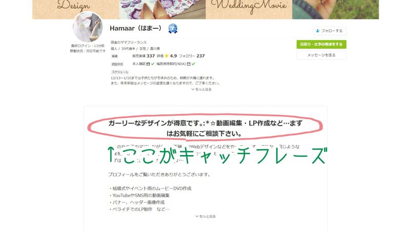 例えば、私の場合「2人の女の子のママ」明記しているので、主婦がターゲットの広告動画の依頼や、キッズYoutuberの動画編集依頼などをプロフィール経由でいただいたことがあります。