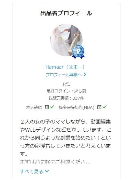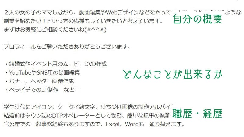 職歴などを書く欄も別にありますが、プロフィールを見る購入者さんが読むのは大体ここなので、出品しているサービス内容に特に関係のある職歴や経歴がある方は、こちらにも書いておくことをおススメします。