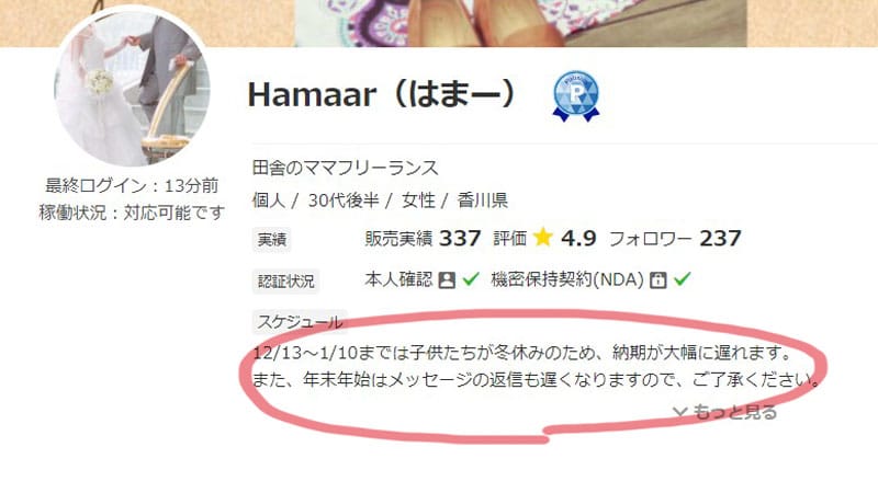 何か急用などがあって、普段と稼働時間が異なる場合や、納品が遅くなりそうな場合などは、最初にそのことを記載しましょう。サービスページにも表示されるので、購入者さんにあらかじめ伝わりやすいです。