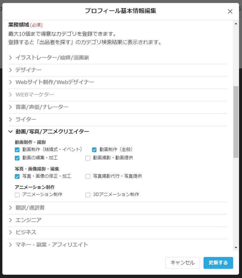 ここでチェックを入れていないジャンルを検索した場合、あなたのプロフィールは表示されません。動画編集をする人なら「動画制作(イベント・結婚式)」「動画制作(全般)」「動画の編集・加工」これら全てにチェックをいれておかないともったいないです。